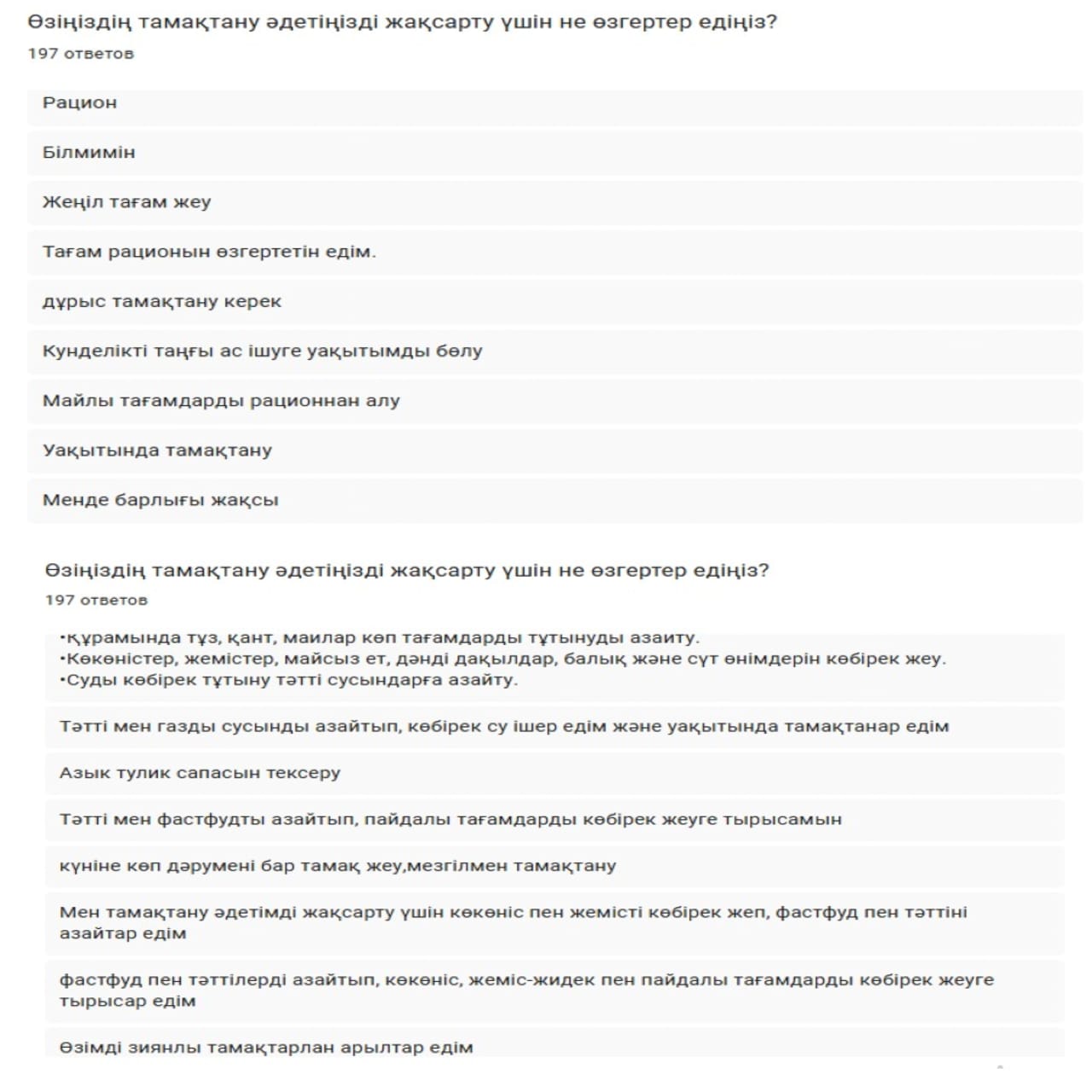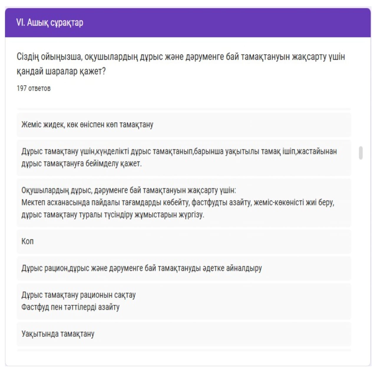 Сауалнама нәтижелері оқушылардың салауатты өмір салтына деген көзқарасы қалыптасқанын және тамақтану мәдениеті бойынша білім деңгейінің жеткілікті екенін айқындады. Бұл – лицей-интернатта жүргізіліп жатқан денсаулық сақтау, профилактикалық және тәрбие жұмыстарының оң нәтижесі екенін дәлелдейді.