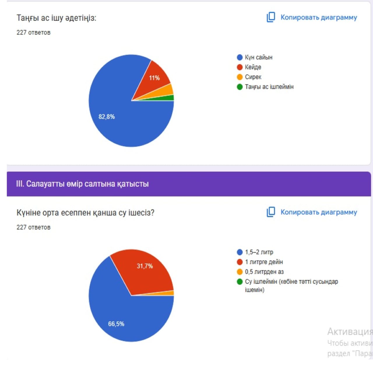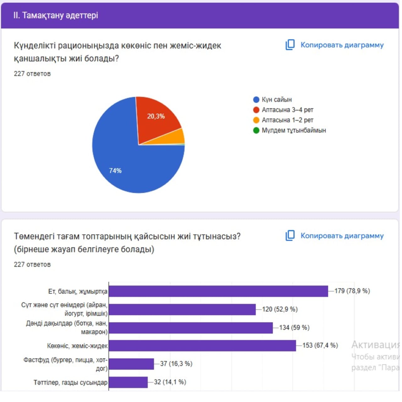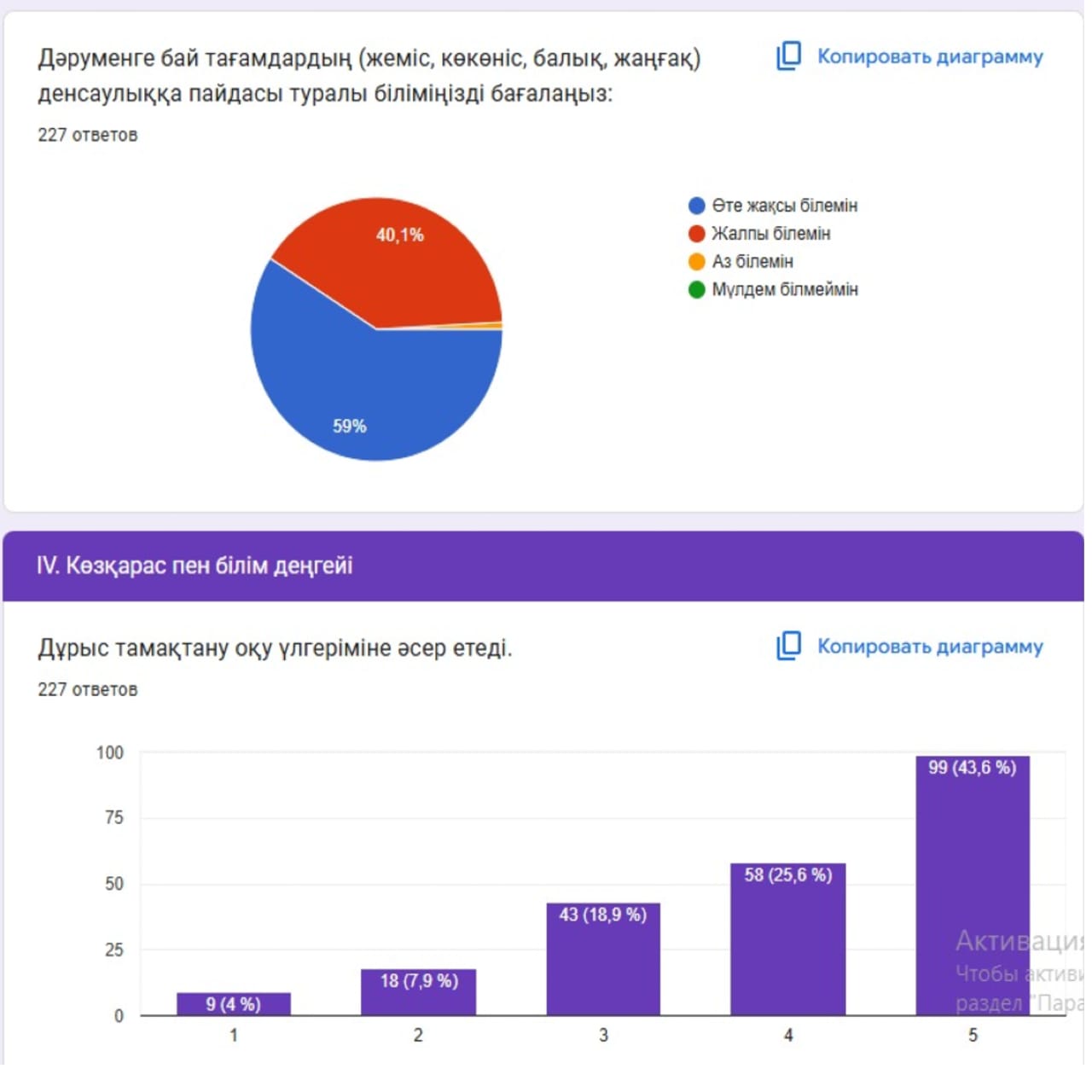 Оқушылардың басым бөлігі күнделікті рационында көкөніс пен жеміс-жидек тұтынатынын, таңғы ас ішудің маңызын білетінін және су ішудің денсаулыққа қажетті екенін атап өтті. Сонымен қатар, дәруменге бай тағамдардың иммунитетті нығайтудағы рөлін дұрыс бағалап, фастфуд пен тәтті тағамдарды шамадан тыс тұтынудың зиян екенін түсінетінін көрсетті.