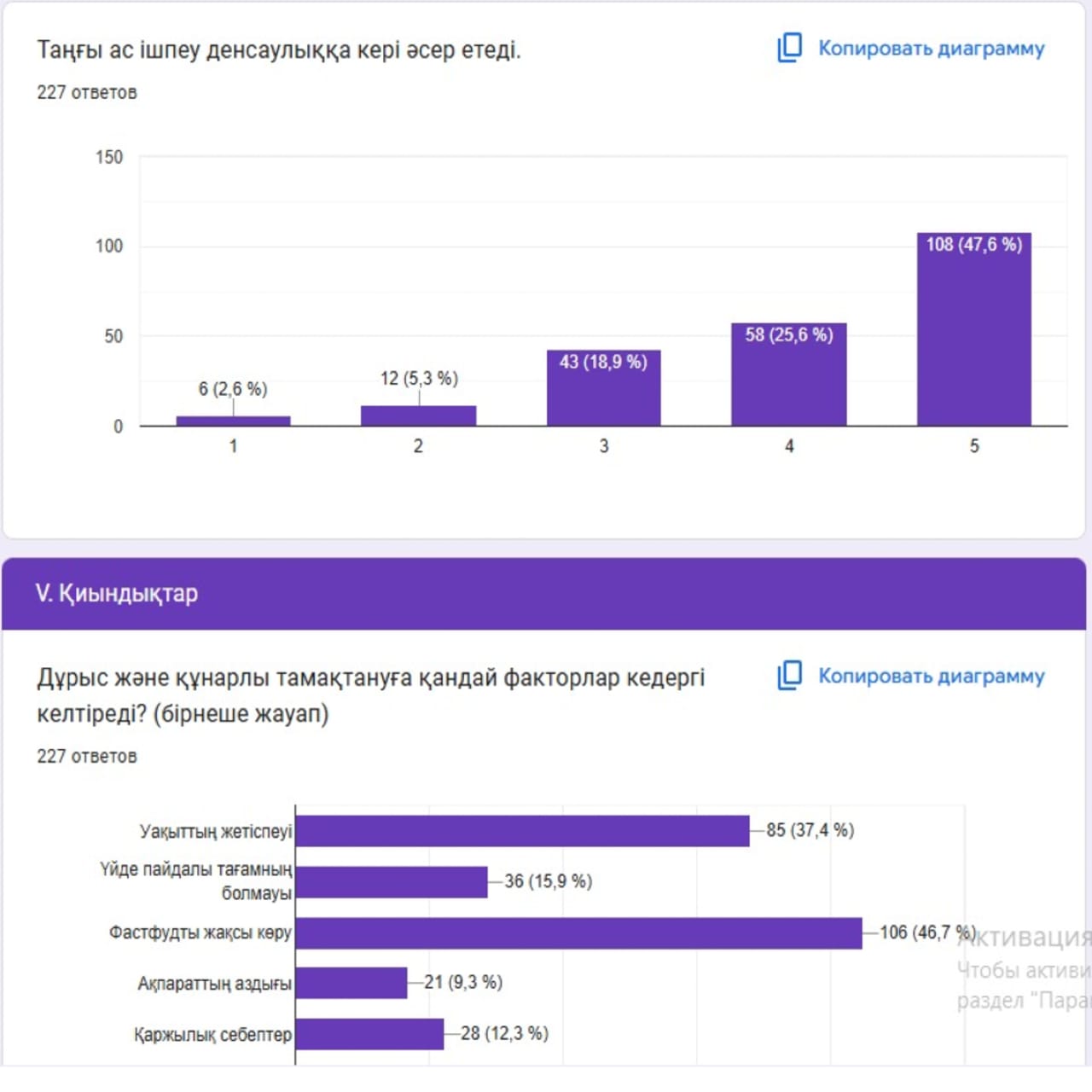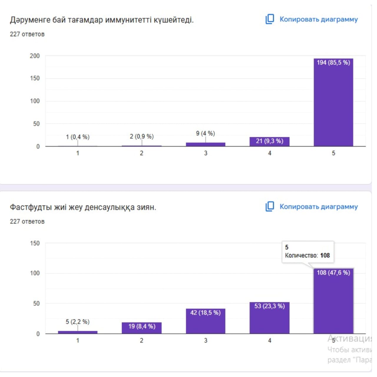 Оқушылардың басым бөлігі күнделікті рационында көкөніс пен жеміс-жидек тұтынатынын, таңғы ас ішудің маңызын білетінін және су ішудің денсаулыққа қажетті екенін атап өтті. Сонымен қатар, дәруменге бай тағамдардың иммунитетті нығайтудағы рөлін дұрыс бағалап, фастфуд пен тәтті тағамдарды шамадан тыс тұтынудың зиян екенін түсінетінін көрсетті.